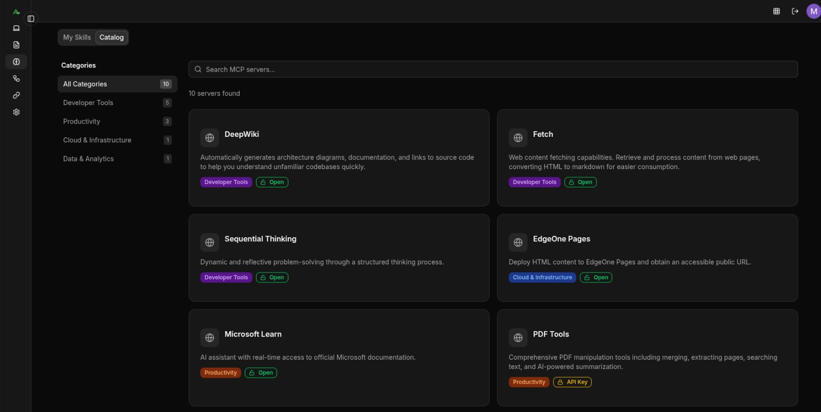 Beyond these generic integrations, the platform supports adding proprietary MCP connectors defined using the JSON standard. This approach allows organizations to extend the system through integrations tailored to their internal environment without requiring extensive specialized development. These connectors can integrate enterprise systems such as custom internal applications, financial information systems, project management tools, or internal databases. Because these capabilities exist as connectors rather than embedded logic, the platform remains adaptable as models and tools evolve.