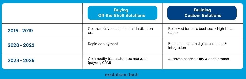 When the internet era began, businesses found it essential to develop innovative software for the well-functioning of their internal operations. With few specialized tools available on the market, they built these solutions themselves, which eventually led them to offer their proprietary software to other businesses with identical requirements. They realized that developing custom tools and systems would provide a competitive edge, ensure a perfect fit with the company’s unique processes, and foster internal expertise. The focus was on leveraging the skills and creativity of existing teams, investing in long-term capability building, and maintaining full control over the development process and the end solution. While this often resulted in highly tailored solutions, it also required significant time, resources, and ongoing maintenance.